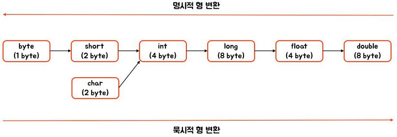 - 기본 데이터 타입은 primitive data type은 byte 수가 작은 쪽에서 큰 쪽으로 변환할 때 따로 명시하지 않아도 자동으로 형 변환이 진행된다.