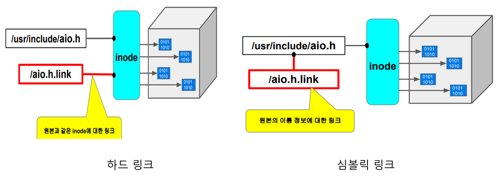 - 소프트 링크(심볼릭 링크) : 파일 이름에다 다른 이름을 붙임 (윈도우에서 바로가기와 유사함)