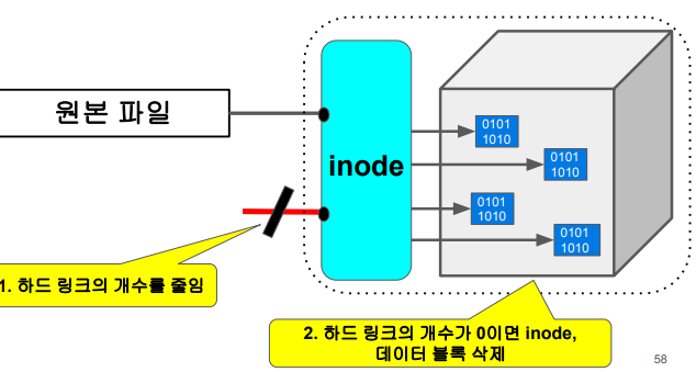 - 연결되어있는 하드 링크의 수가 없을때 데이터 블록을 완전 삭제한다.